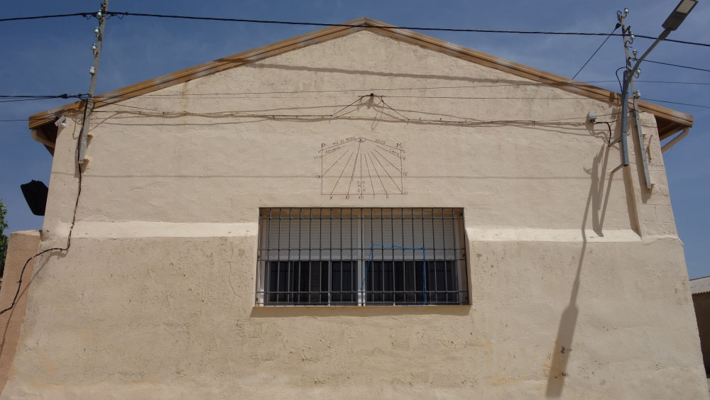 Reloj de Sol situado en la fachada sur del almacén municipal de Villar de Cañas, en calle Travesía de Valencia junto a la Farmacia. Declina a poniente 12,1º Lat: 39,77702 Long: -2,56293. El gnomon es una varilla roscada de 8 mm y 35 cm con dos tuercas en su extremo. El rectángulo del reloj es de 70x80 cm. Marca la hora oficial de verano (hay que restar la EdT, Ecuación del Tiempo). Este reloj lo fabriqué el 02/08/2023.