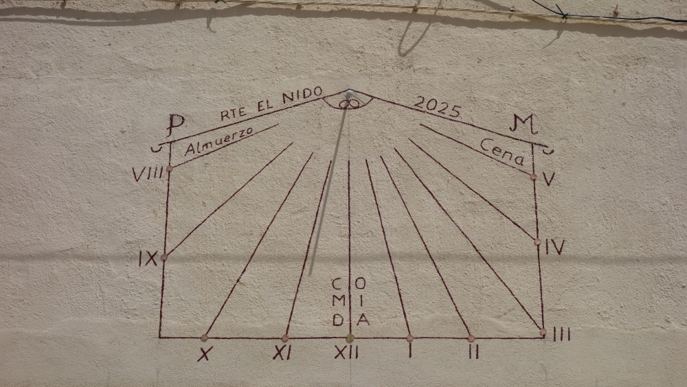 Reloj de Sol en Bar "el Nido" Restaurante, situado en calle Valencia, 25 de Villar de Cañas. Declina a poniente 15,4º Lat: 39,776907 Long: -2,560943. El gnomon es una varilla de aluminio de 8 mm y 32 cm. El rectángulo del reloj es de 120x70 cm. Marca la hora solar. Lleva las iniciales de los dueños Pablo y Mercedes. Este reloj lo fabriqué el 08/08/2025.